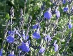 Germander Sage (Salvia) is a small mounding and spreading dense shrub, generally about 18-24 inches in height and 2-3 ft wide. Its dark blue flowers appear from mid-spring through late Fall. Drought tolerant. Likes well-drained soil in full sun though can tolerate some shade.