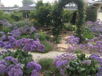 The garden is a never-ending creation, an ongoing collaboration and experiment. A prior owner planted many fruit trees decades ago. I have worked hard to reduce water consumption, keep the garden lush, and maintain the trees. The apricot out front is as old as I am (64 years)! In the back, there is a green gauge plum - no one told it there weren't enough chill hours to grow in Santa Barbara. I keep bees to pollinate the trees, and just to give them a home. They like the rosemary hedge, the statice (limonium) and the alstroemeria in front. (Actually, the hummingbirds, the butterflies...everyone seems to love the alstroemeria.) I have a solar powered fountain in the apiary to supply the bees with water. In addition, I have a fountain as well as multiple bird baths in the back. The sound of water brings in the goldfinches and migrating bluebirds, and provides the moisture the chorus frogs need. I have identified 90 species of birds in or over my yard, as well as multiple nesting species (wrens, nuthatches, and oak titmouse etc.). In addition to providing habitat for the pollinators, birds, and critters, the roses out front attract the homo sapiens: they walk by and smell the flowers (the white hybrid tea "Sugar Moon" is the best!).