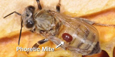 Varroa are an external parasitic mite that attach to the honey bees and fly back with them to the hive where they feed on the larvae and adult bees.